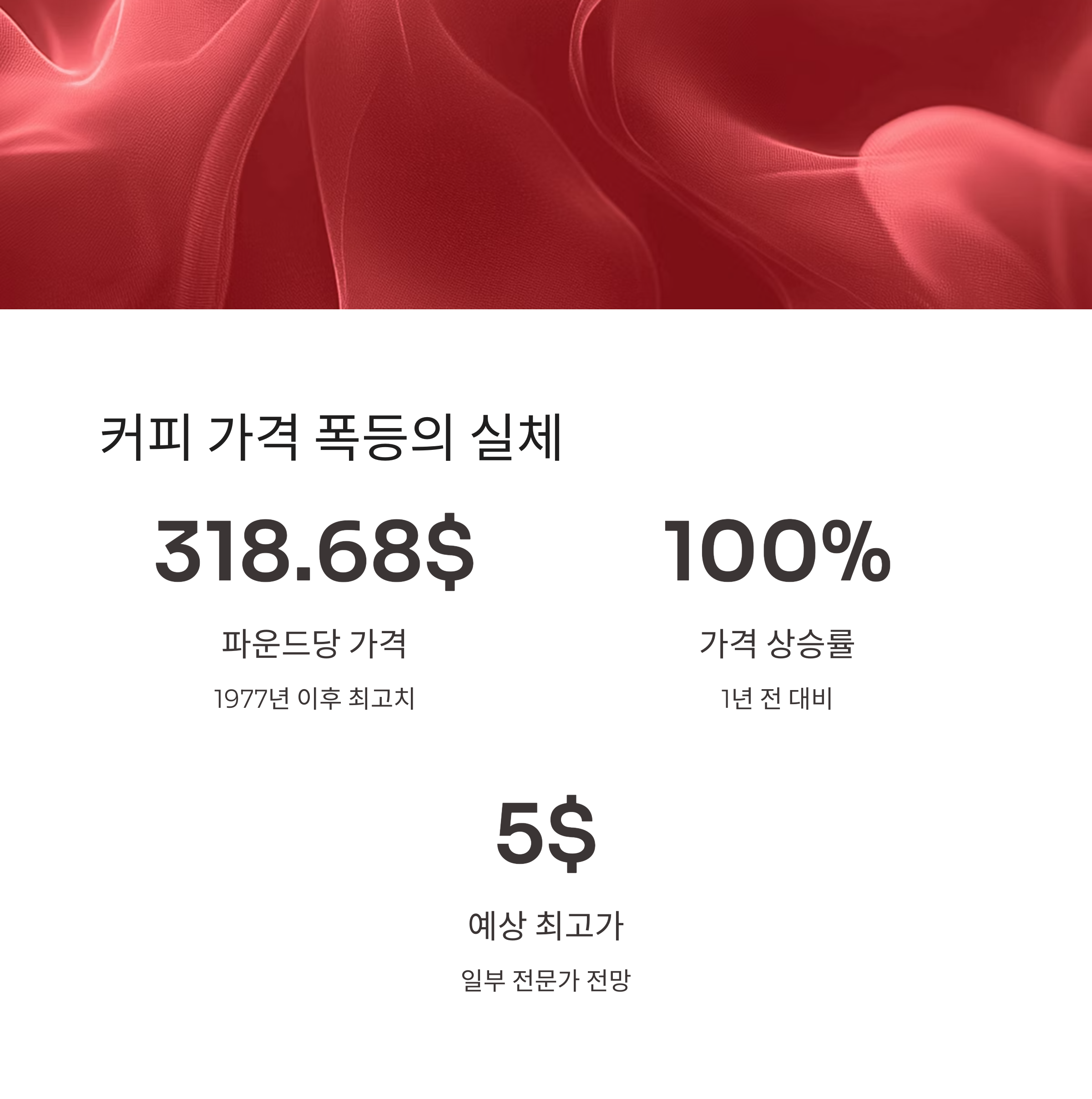 2025년 6월 기준 커피 가격이 파운드당 318.68달러를 기록하며, 1977년 이후 48년 만에 최고치를 달성했습니다. 1년 전 1.94달러에서 현재 4.21달러로 약 100% 급등한 상황으로, 커피 업계 전반에 충격을 주고 있습니다.