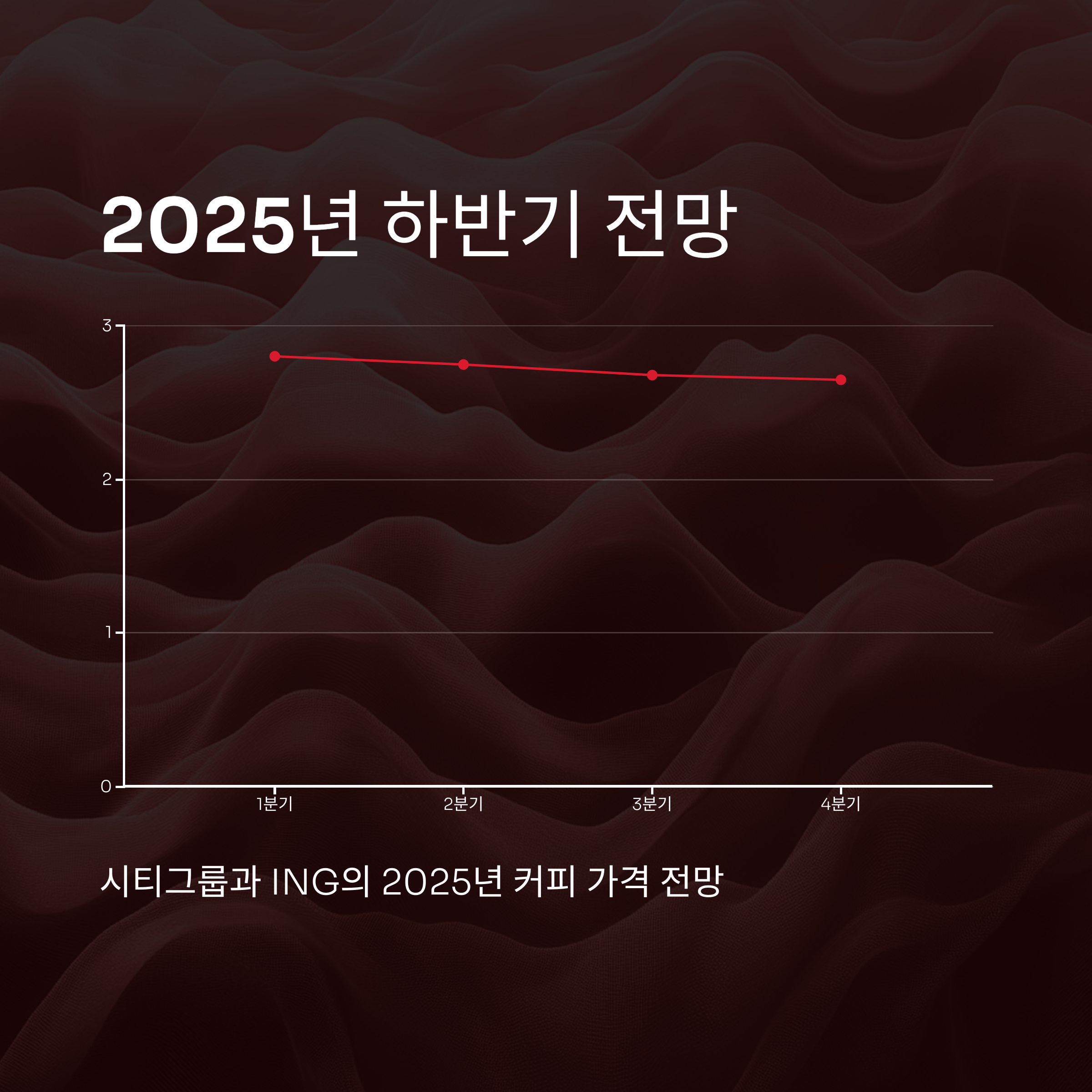 ING는 2024년 12월 전망에서 2025년 미국 커피의 연평균 가격을 2.68달러로 예측했으며, 분기별로는 1분기 2.80달러를 전망했습니다. 이는 현재의 높은 가격 수준이 당분간 지속될 것임을 시사합니다.