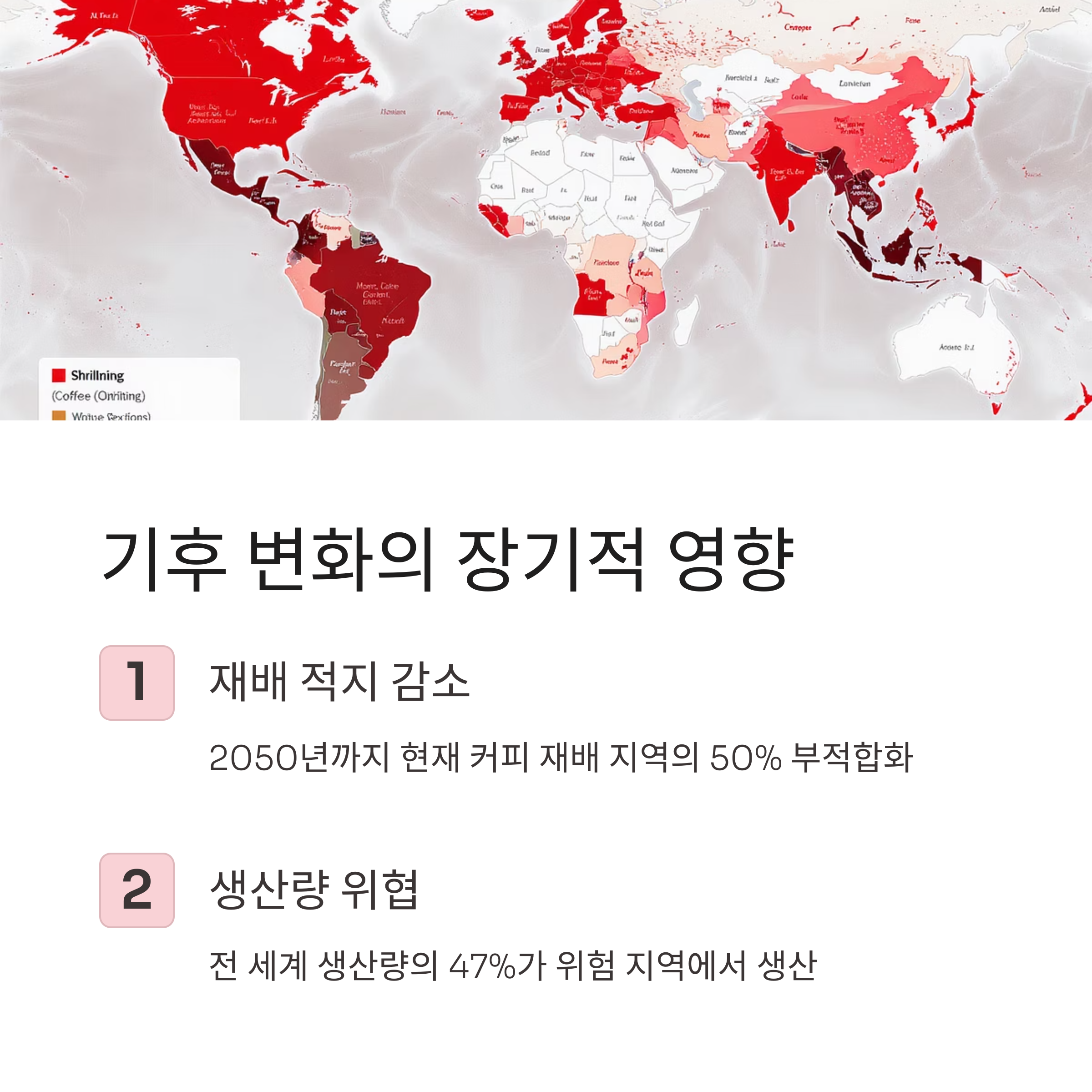 IPCC 보고서에 따르면 2050년까지 현재 커피 재배 지역의 50%가 아라비카 생산에 부적합해질 것으로 예상됩니다. 이는 전 세계 커피 공급에 심각한 위협이 되며, 장기적으로 가격 상승 압력을 지속시킬 것입니다.