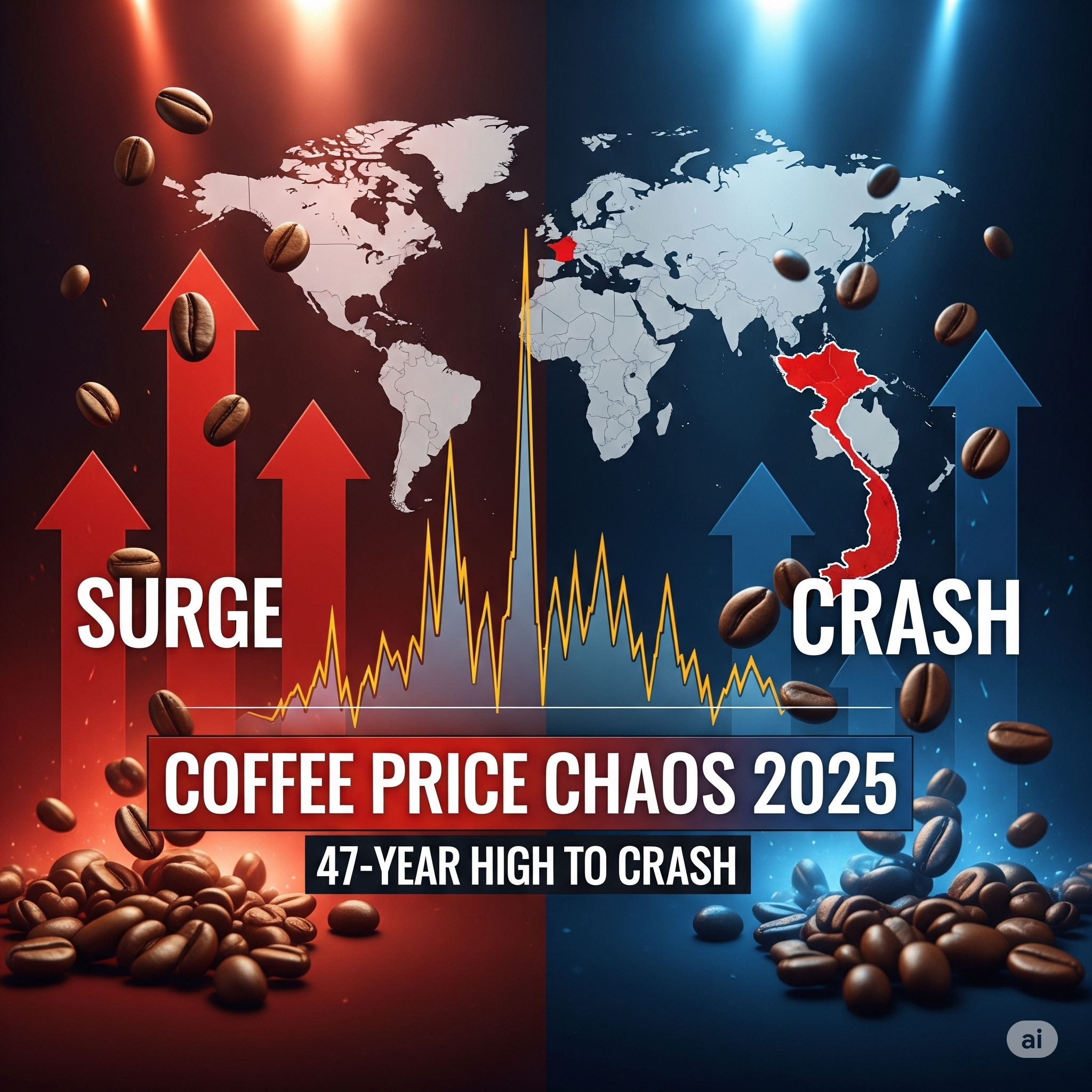 2025년 커피 가격이 47년 만에 최고치를 기록한 후 급락하는 극심한 변동성을 보이고 있습니다. 기후 변화, 투기 자본, 지정학적 리스크, 공급망 차질 등 커피 가격 폭등과 폭락을 유발하는 핵심 변수들을 완벽 분석하고 향후 전망을 제시합니다.